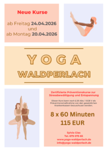 | MONTAG | 20:15 – 21:15 | 20.04.2026 | 10 Übungsstunden à 60 Min | Yoga – Stressprävention Sanftes Üben mit Meditation; für Anfänger und Geübte Bezuschussung durch ges. Krankenkasse möglich |
